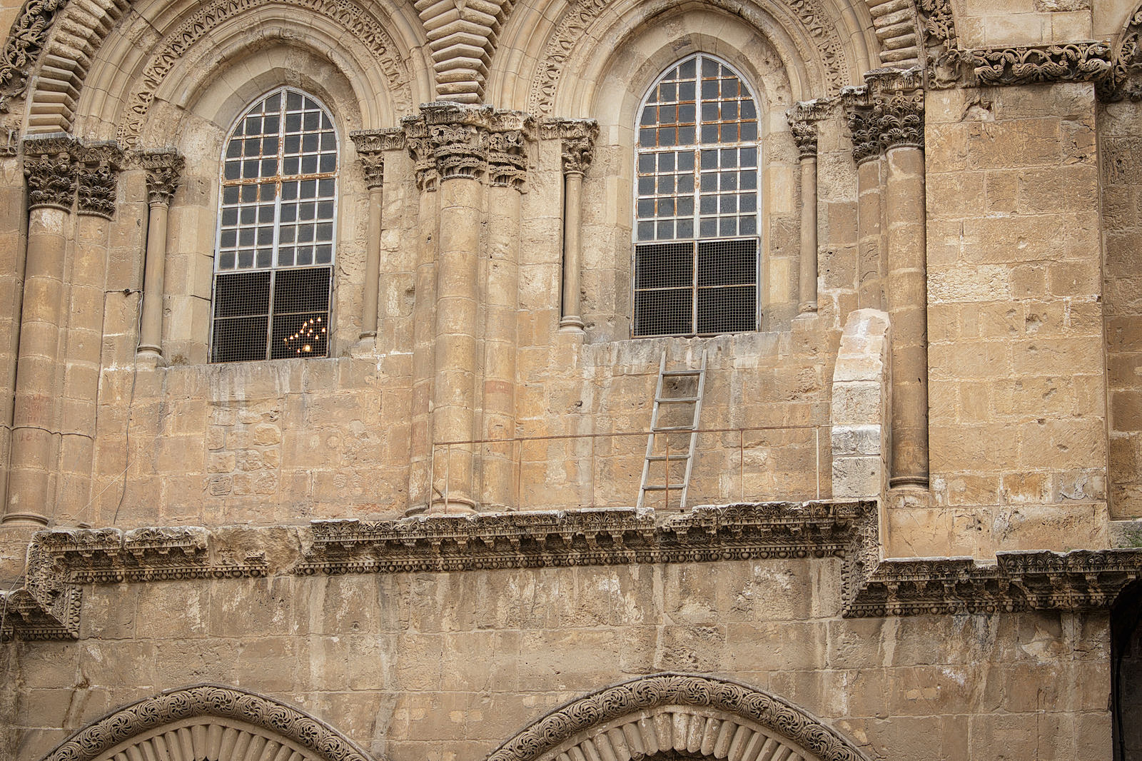 Το πιο εμβληματικό σύμβολο αυτής της εύθραυστης ισορροπίας είναι η περίφημη «Ακίνητη Σκάλα»: μια ξύλινη σκάλα που βρίσκεται στο ίδιο σημείο της πρόσοψης του ναού από τον 18ο αιώνα. Κανείς δεν την μετακινεί, γιατί κανένα δόγμα δεν αναγνωρίζει το δικαίωμα του άλλου να το κάνει.