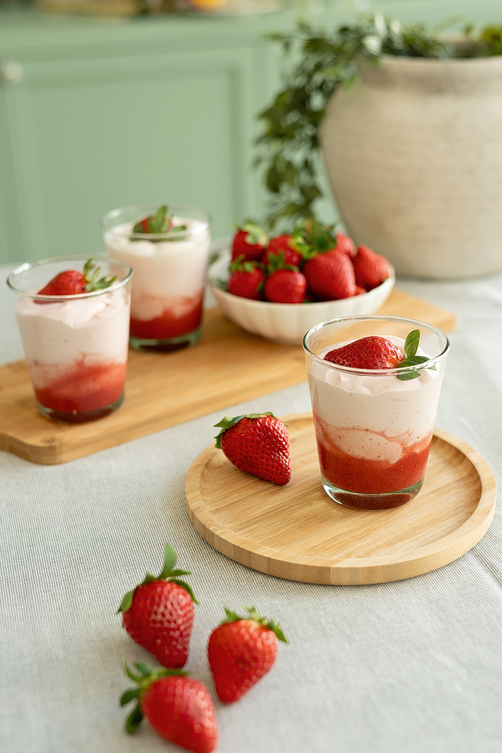 - Μοιράζουμε τον πουρέ που κρατήσαμε σε τέσσερα ποτήρια ή μπολ και προσθέτουμε από πάνω τη μους φράουλας. Μεταφέρουμε τη μους στο ψυγείο για τουλάχιστον μία ώρα –ιδανικά για όλη τη νύχτα – να σφίξει. Σερβίρουμε γαρνίροντας με φρέσκες κομμένες φράουλες.