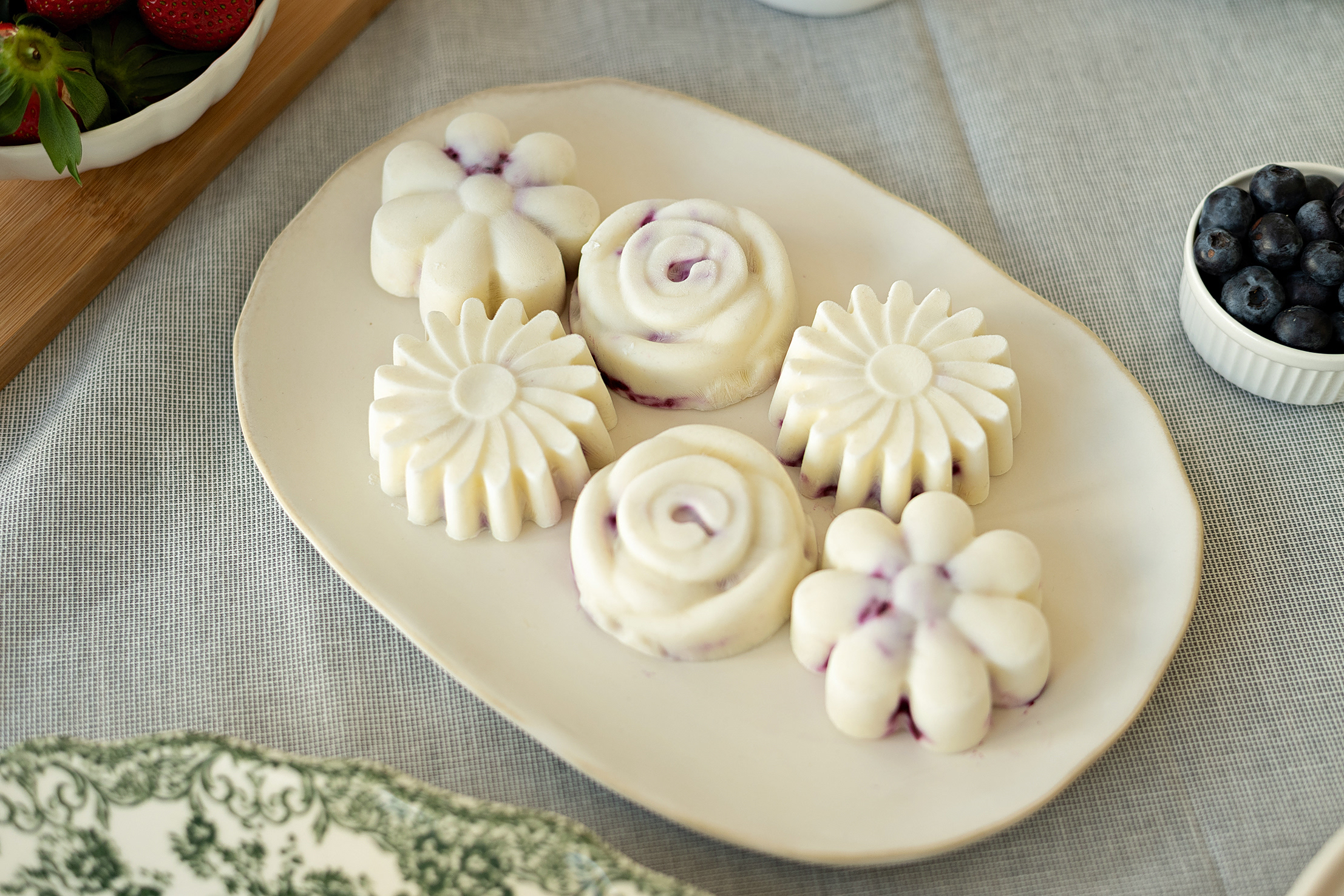 - Βάζουμε από 1 κ.σ. μείγμα γιαουρτιού στις θήκες μιας μίνι φόρμας σιλικόνης για σοκολατάκια ή σε παγοθήκη (να γεμίσουν περίπου κατά τα 3/4). Προσθέτουμε από πάνω από 1/2 κ.γ. κρύα κομπόστα μύρτιλου και δημιουργούμε σχέδια με μια οδοντογλυφίδα ή με τη μύτη του μαχαιριού.