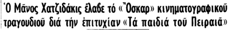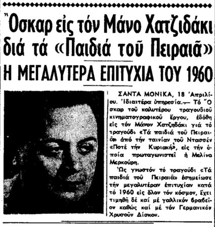 «Ο Έλλην συνθέτης κ. Μάνος Χατζιδάκις ετιμήθη χθες με το βραβείον Όσκαρ του καλύτερου κινηματογραφικού τραγουδιού του έτους 1960 δια την σύνθεσίν του “Τα παιδιά του Πειραιά”, που ηκούετο εις την πασίγνωστον πλέον ταινίαν του Ζυλ Ντασσέν “Ποτέ την Κυριακή”.