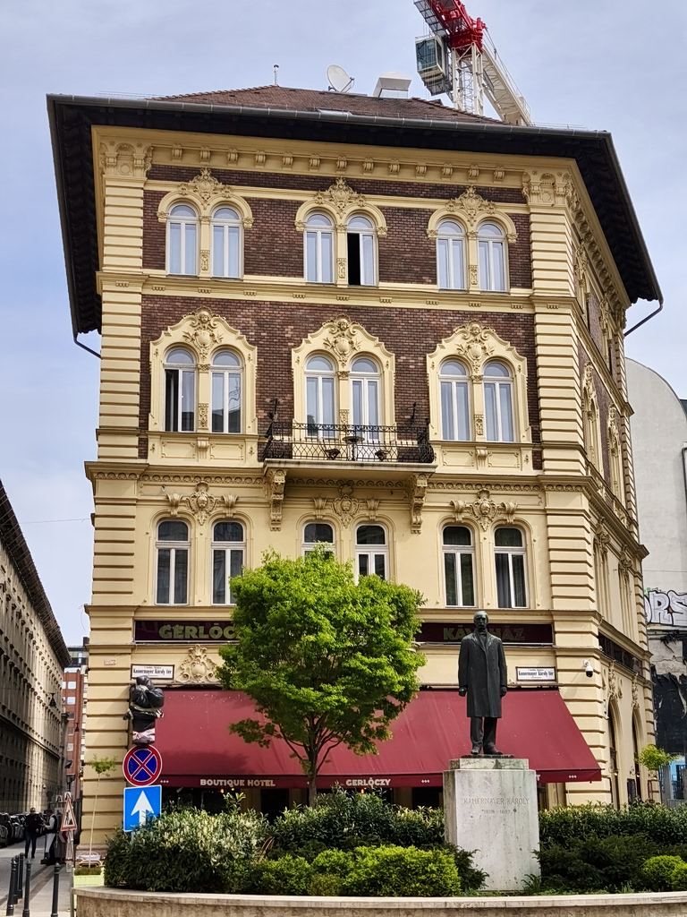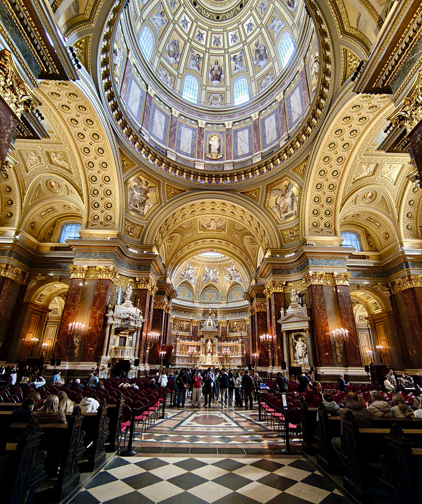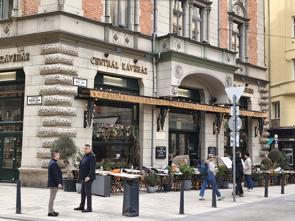 Ξεκινάμε τη βόλτα μας με ένα καφέ στο Central Grand Café, ένα από τα πιο ιστορικά και εμβληματικά καφέ της πόλης, που άνοιξε τις πόρτες του το 1887 και γρήγορα έγινε το αγαπημένο στέκι συγγραφέων, καλλιτεχνών και διανοουμένων. Κατά τη διάρκεια του 2ου Παγκοσμίου Πολέμου, υπέστη ζημιές, αλλά ανακαινίστηκε πιστά, στις αρχές του 2000 και ξανά το 2022. Μπαίνοντας, νιώθεις σα να γυρνάς πίσω στον χρόνο: ψηλά ταβάνια, πολυέλαιοι, δερμάτινοι καναπέδες, μαρμάρινα τραπέζια και τοίχοι γεμάτοι φωτογραφίες και πορτραίτα ιστορικών θαμώνων. Πληρώσαμε 18 ευρώ για δύο καφέδες. Είναι λιγότερο τουριστικό και πιο αυθεντικό από το New York Café, που οι ούγγροι φίλοι μας μας συμβούλευσαν να αποφύγουμε.