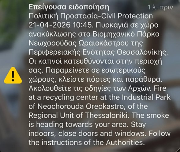 «Οι καπνοί κατευθύνονται στην περιοχή σας. Παραμείνετε σε εσωτερικούς χώρους, κλείστε πόρτες και παράθυρα. Ακολουθείτε τις οδηγίες των Αρχών».