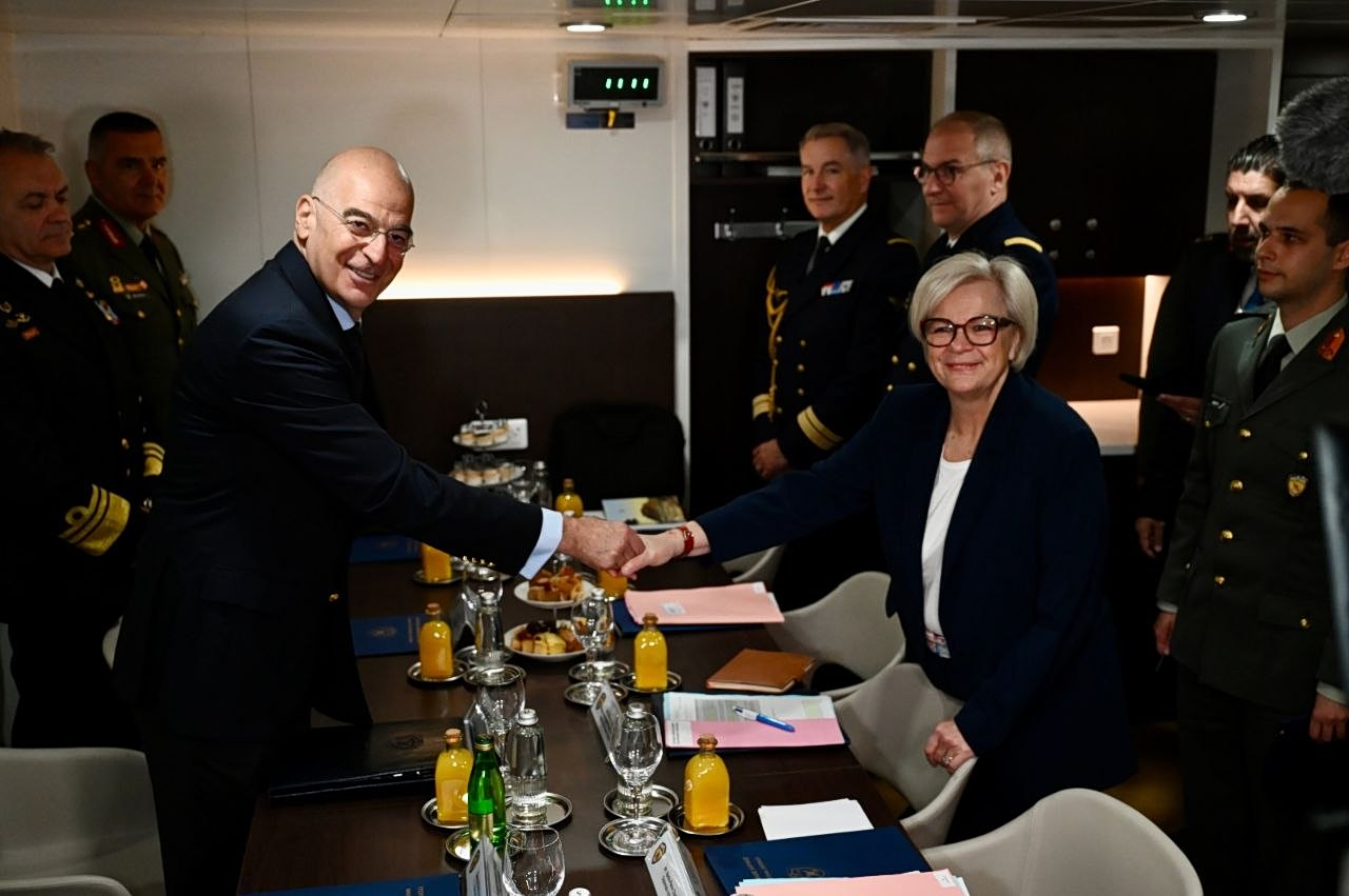 Διμερή συνάντηση με τη Γαλλίδα ομόλογό της Catherine Vautrin πραγματοποίησε επί της φρεγάτας «Κίμων» η ελληνική πλευρά, με αντικείμενο την περαιτέρω ενίσχυση της αμυντικής συνεργασίας Ελλάδας–Γαλλίας. Στο επίκεντρο της συζήτησης βρέθηκαν τρόποι σύσφιξης των ήδη στενών διμερών σχέσεων, σε ένα περιβάλλον αυξημένων προκλήσεων ασφάλειας.