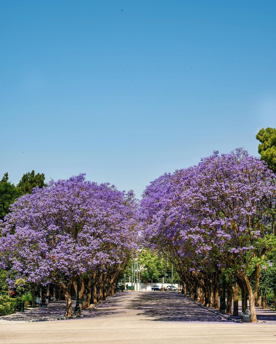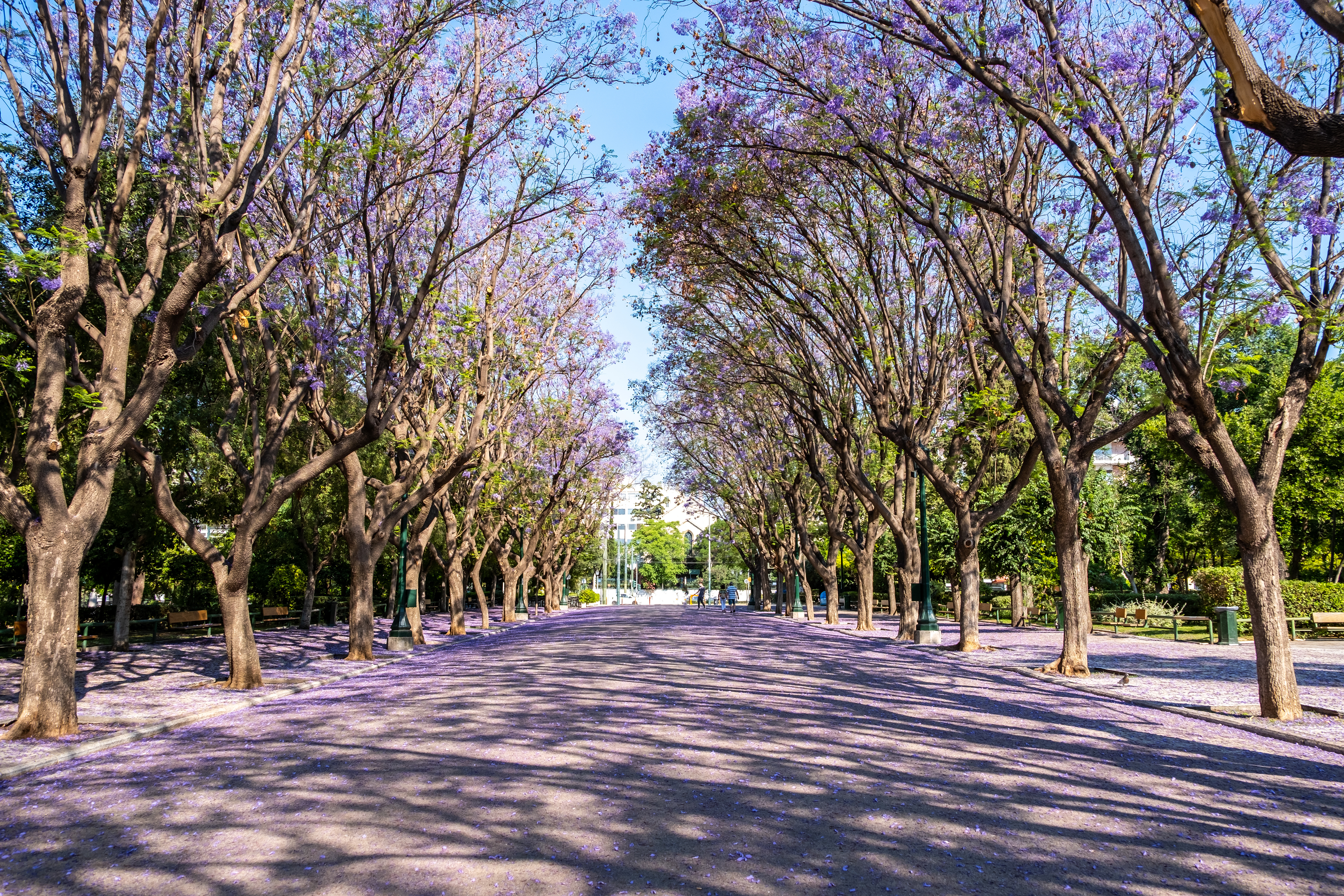 Οι μωβ ταξιανθίες εμφανίζονται σχεδόν ταυτόχρονα και για λίγες εβδομάδες μετατρέπουν τις δεντροστοιχίες σε πανδαισία χρώματος. Τα πέταλα πέφτουν συνεχώς στο έδαφος, δημιουργώντας ένα απαλό χαλί. Σε ορισμένα σημεία μοιάζει σαν να έχει χιονίσει – μόνο που το «χιόνι» είναι μωβ.