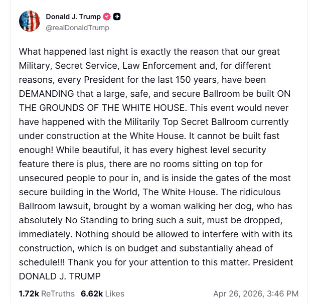 «Αυτό που συνέβη χθες το βράδυ είναι ακριβώς ο λόγος για τον οποίο ο σπουδαίος Στρατός μας, η Μυστική Υπηρεσία, οι Αρχές Επιβολής του Νόμου και, για διαφορετικούς λόγους, κάθε Πρόεδρος τα τελευταία 150 χρόνια, ΑΠΑΙΤΟΥΝ να κατασκευαστεί μια μεγάλη, ασφαλής και προστατευμένη αίθουσα δεξιώσεων ΕΝΤΟΣ ΤΩΝ ΟΡΙΩΝ ΤΟΥ ΛΕΥΚΟΥ ΟΙΚΟΥ.