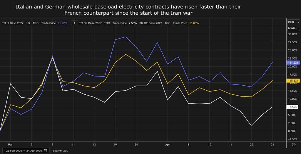 - Γαλλία: Βασιζόμενη κατά 70% στην πυρηνική ενέργεια, η αύξηση ήταν η μισή από εκείνη της Ιταλίας.