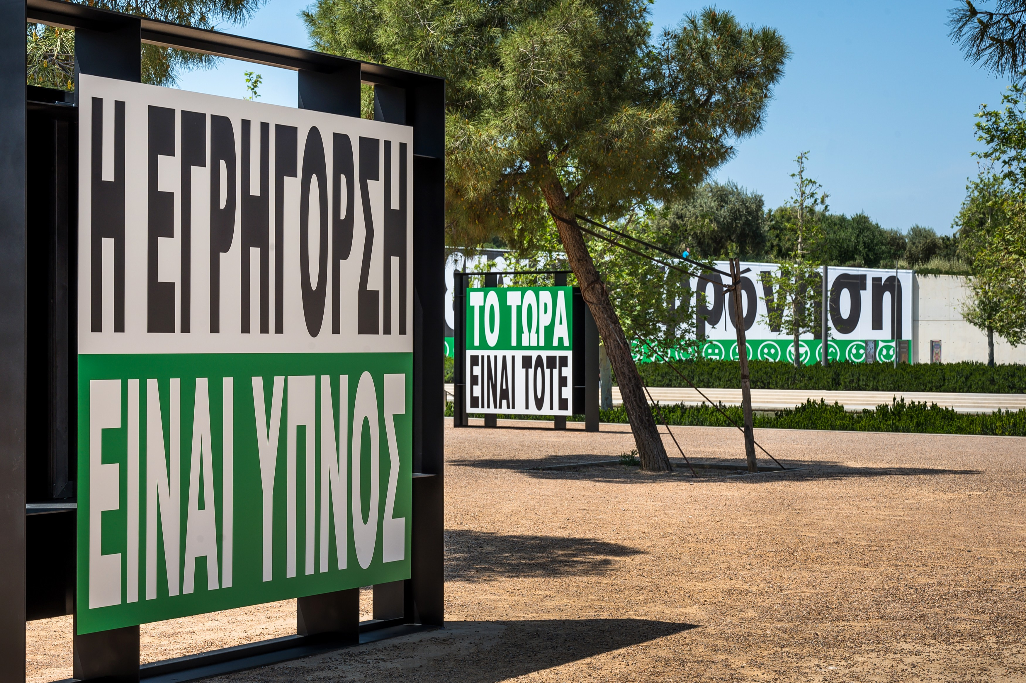 Στην απέναντι πλευρά του Καναλιού του ΚΠΙΣΝ, διάσπαρτες στην Εσπλανάδα, ορθώνονται ανάμεσα στα δέντρα μεγάλες μεταλλικές κατασκευές που φέρουν τολμηρά μηνύματα. Πρόκειται για ακόμη μία έκθεση με διεθνές καλλιτεχνικό στίγμα στον δημόσιο χώρο του ΚΠΙΣΝ.