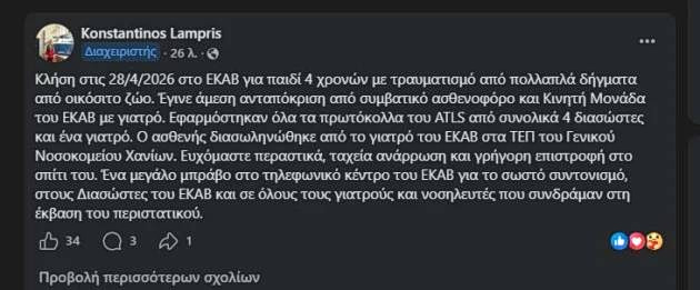 Μέσα από ανάρτησή τους, οι διασώστες του ΕΚΑΒ Χανίων κάνουν ιδιαίτερη αναφορά στον άρτιο συντονισμό του τηλεφωνικού κέντρου και τη συνεργασία όλων των εμπλεκόμενων – διασωστών, γιατρών και νοσηλευτών – που λειτούργησαν ως μια αλυσίδα ζωής για το 4χρονο αγόρι.