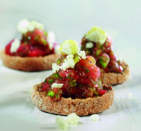 YΛΙΚΑ (για 12 κομμάτια) 2 αγγουράκια, τριμμένα και στραγγισμένα στο σουρωτήρι 3 μεγάλες ώριμες ντομάτες, ψιλοκομμένες ½ πράσινη πιπεριά, ψιλοκομμένη 1 σφηνοπότηρο ούζο αλάτι και φρεσκοτριμμένο πιπέρι 12 κρίθινα παξιμαδάκια 1 φλ. φέτα, τριμμένη 2 κ.σ. έ.π. ελαιόλαδο 1 κ.σ. ξηρή ρίγανη ΕΚΤΕΛΕΣΗ Σε ένα μπολ βάζουμε τα αγγουράκια, τις ντομάτες, την πιπεριά και το […]