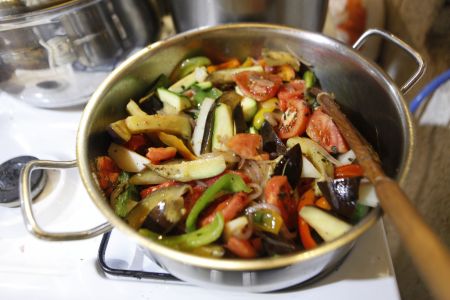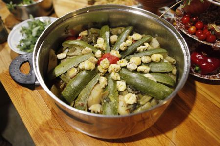 Τα λαχανικά μαγειρεύονται σε στρώσεις και το μυστικό είναι να μαγειρέψουμε σε πολύ χαμηλή φωτιά. Κλασική ικαριώτικη συνταγή στην οποία η κυρία Καρίμαλη πρόσθεσε και κάστανα που ταίριαξαν εξαιρετικά.