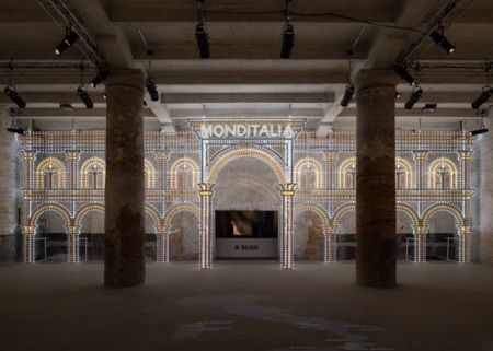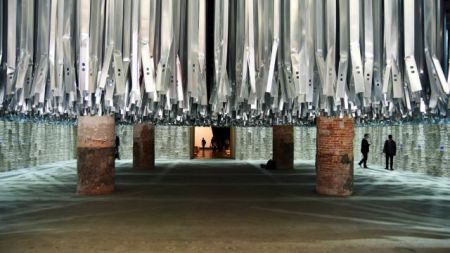 Στην είσοδο της κύριας έκθεσης της διεθνούς Μπιενάλε αρχιτεκτονικής στο Αρσενάλι της Βενετίας τον επισκέπτη υποδέχεται ένα εντυπωσιακό σκηνικό από αναρτημένα στοιχεία αλουμινίου σε πυκνή διάταξη,