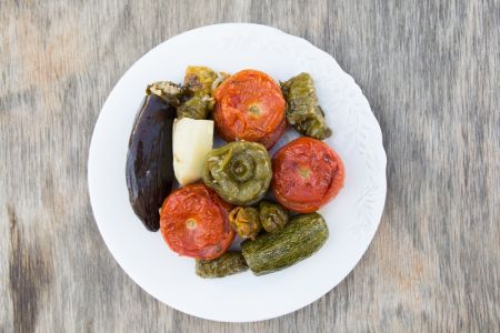 Στην αυθεντική εκδοχή των καλοκαιρινών κρητικών γεμιστών το ταψί γεμίζει με όλα τα καλά του κήπου. Ντομάτες, μελιτζάνες, κολοκυθάκια και πατάτες, και πάντα από δίπλα λίγα κληματόφυλλα και αθοί (κολοκυθολούλουδα).