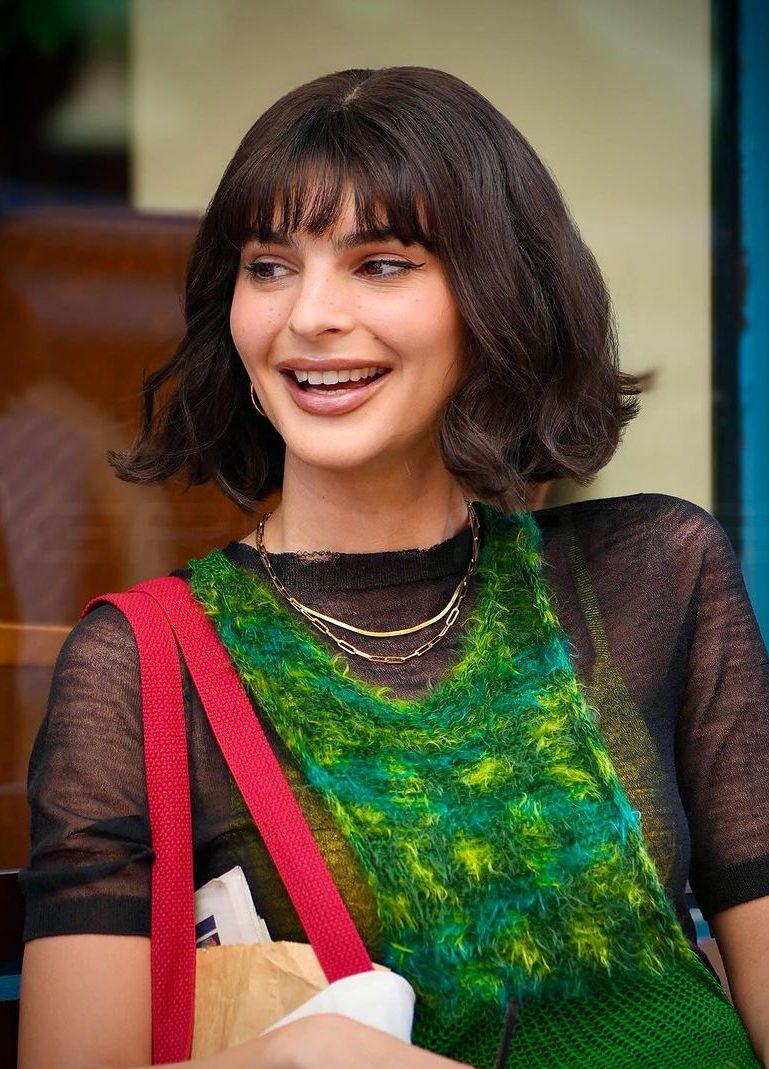 Τα ελαφρώς κυματιστά μαλλιά της Emily Ratajkowski φτάνουν ακριβώς στο ύψος του πηγουνιού της χαρίζοντάς μια σοφιστικέ διάθεση στο στιλ της. Οι αφέλειες, από την άλλη, που φτάνουν ακριβώς πάνω από τα φρύδια της, δίνουν στο κούρεμα μια αρτιστίκ πινελιά. Πολλοί φανς της έσπευσαν να σχολιάσουν πως πρόκειται για περούκα, ενώ η ίδια δεν έχει αποκαλύψει ακόμη λεπτομέρειες.