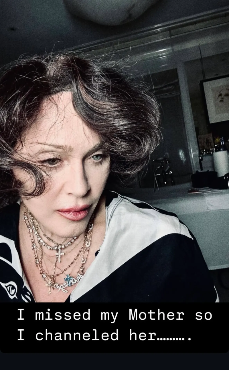 Η Madonna μοιράστηκε στα Instagram Stories της μερικές φωτογραφίες της λέγοντας ότι αποφάσισε να γίνει μελαχρινή επειδή σκεφτόταν τη μητέρα της, Madonna Louise Ciccone, η οποία πέθανε από καρκίνο του μαστού όταν εκείνη ήταν μόλις πέντε ετών. «Μου έλειψε η μητέρα μου, οπότε είπα συνδεθώ μαζί της» έγραψε η Madonna στο story που κοινοποίησε. Επομένως, τα «χρυσά» ξανθά μαλλιά με τις σκούρες ρίζες που είδαμε να έχει στο MET Gala 2025, δεν ήταν πια εκεί και τη θέση τους πήρε μια μελαχρινή απόχρωση με διακριτικές ανταύγειες σε τόνους του γκρι.