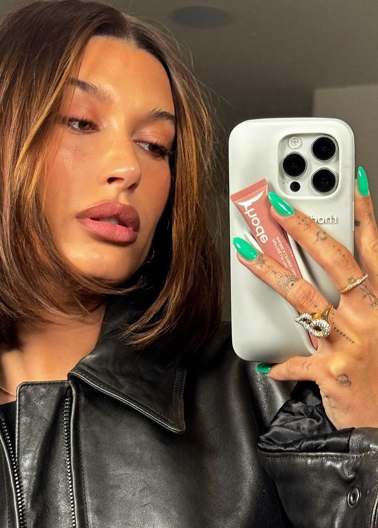 Μία από αυτές ήταν μια selfie της στον καθρέφτη όπου πόζαρε με τα πράσινα νύχια της σε σχήμα αμυγδάλου και κρατούσε το κινητό της με την εμβληματική θήκη της εταιρείας της, Rhode, και το Rhode lip gloss. Ωστόσο, εκείνο που μας εντυπωσίασε περισσότερο είναι πως σε μια άλλη φωτογραφία βλέπουμε τα νύχια της να λάμπουν στο σκοτάδι, γεγονός που μας αποκάλυψε πως πρόκειται για μια neon απόχρωση του πράσινου.