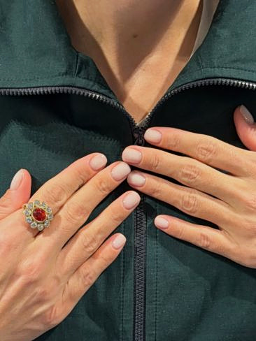 Επιλέγοντας ένα σύνολο που ισορροπούσε ιδανικά ανάμεσα στο casual και το κομψό, συνδύασε ένα διαχρονικό σκούρο μπλε τζιν με μπλούζα σε απόχρωση olive, δημιουργώντας μια ήρεμη, γήινη βάση. Η χρωματική αυτή παλέτα λειτούργησε ως το τέλειο υπόβαθρο για το κομμάτι που πραγματικά ξεχώρισε: ένα μαντό σε ζωηρές αποχρώσεις, που πρόσθεσε ένταση, φρεσκάδα και χαρακτήρα στο look.