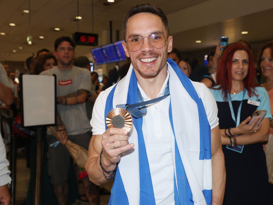 Ο κορυφαίος αθλητής αγκαλιάστηκε από τους παρευρισκόμενους στο αεροδρόμιο σε μια ιδιαίτερη υποδοχή ενώ τα χειροκροτήματα κορυφώθηκαν καθώς ο ολυμπιονίκης ήταν σκεπασμένος με την ελληνική σημαία.