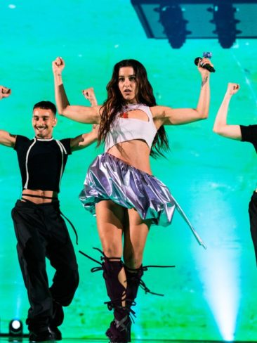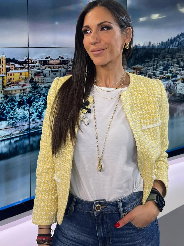 Η ηθοποιός εμφανίζεται να φορά ένα κλασικό λευκό πουκάμισο και μαύρο παντελόνι με ζώνη με χρυσή λεπτομέρεια. Χρυσά είναι επίσης τα γεωμετρικά σκουλαρίκια της.