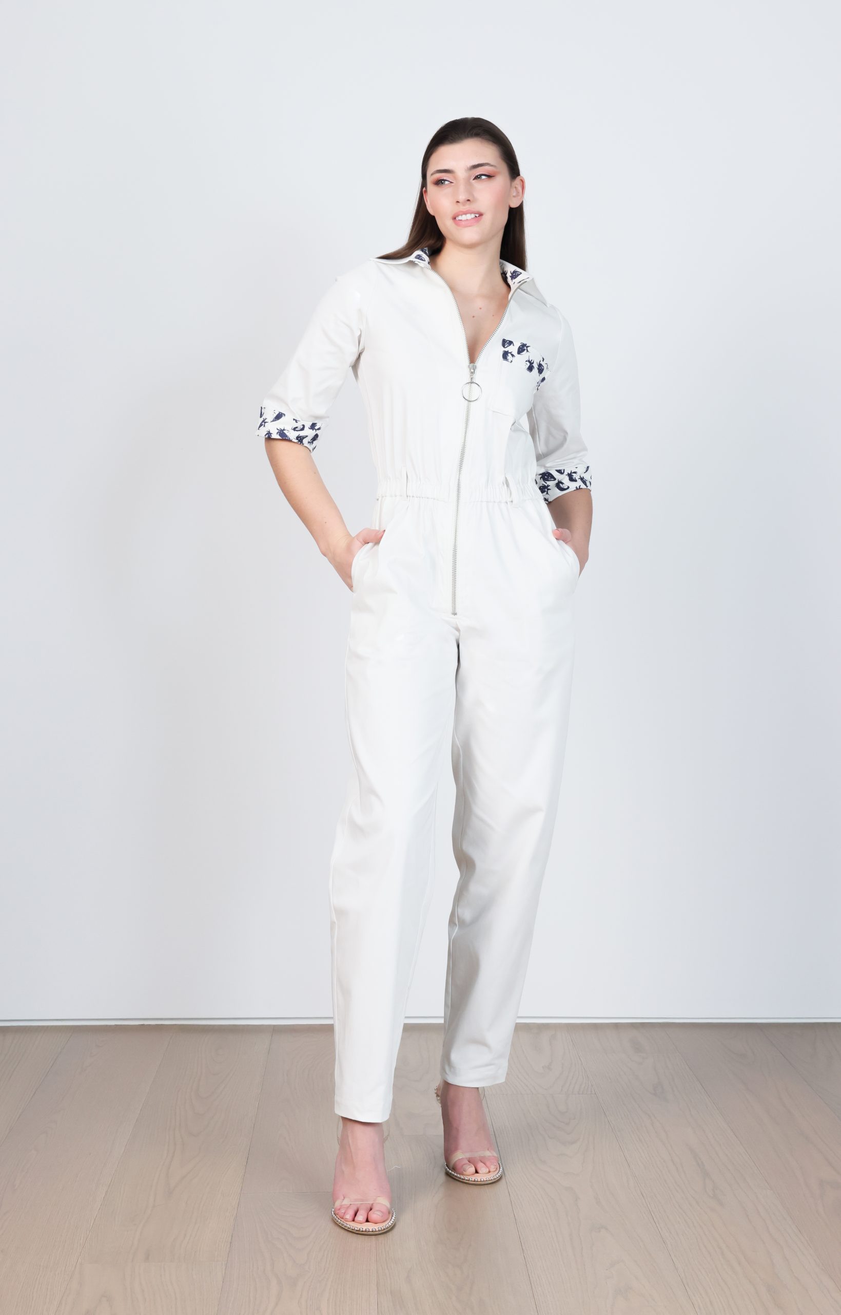 Μια jumpsuit είναι συνώνυμο της ευελιξίας. Είναι το κομμάτι που θα κάνει την καθημερινότητα μας και ιδίως τα πρωινά που ετοιμαζόμαστε πιο εύκολα και θα μας απαλλάξουν από τον προβλημαστισμό του «τι φοράμε πάλι σήμερα»; Σε λευκό, είναι καλοκαιρινή και super stylish, ενώ η λεπτομέρεια με διακριτικό print στον γιακά τα μανίκια και την τσέπη την κάνει να δείχνει ακόμα πιο φρέσκια, cool και νεανική.