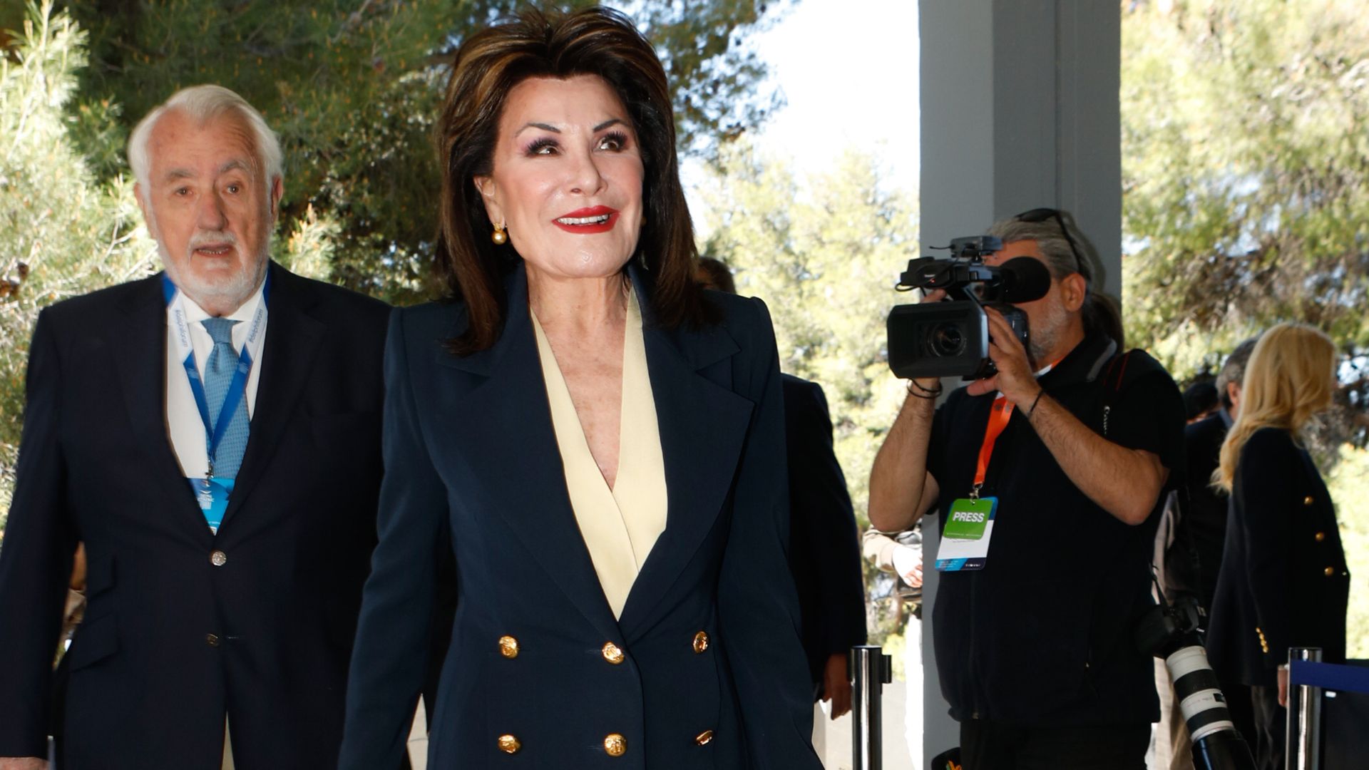 Για την περίσταση και για να ανέβει στο βήμα, η κυρία Γιάννα Αγγελοπούλου επέλεξε ένα κλασικό και κομψό σύνολο. Φορούσε σακάκι και παντελόνι σε navy blue απόχρωση και κλασικές δίχρωμες γόβες. Συγκεκριμένα το σακάκι της είχε τονισμένους ώμους και τρεις σειρές από χρυσά κουμπιά, ενώ το παντελόνι ήταν cropped, ιδανικό μήκος για την άνοιξη. Από μέσα φορούσε μπλούζα με V ντέκολτε σε butter yellow απόχρωση. Την εμφάνιση ολοκλήρωσε με γόβες και τσάντα του οίκου Chanel.