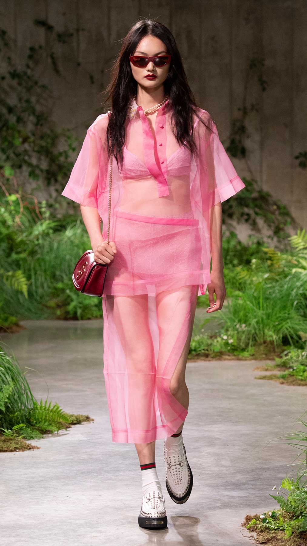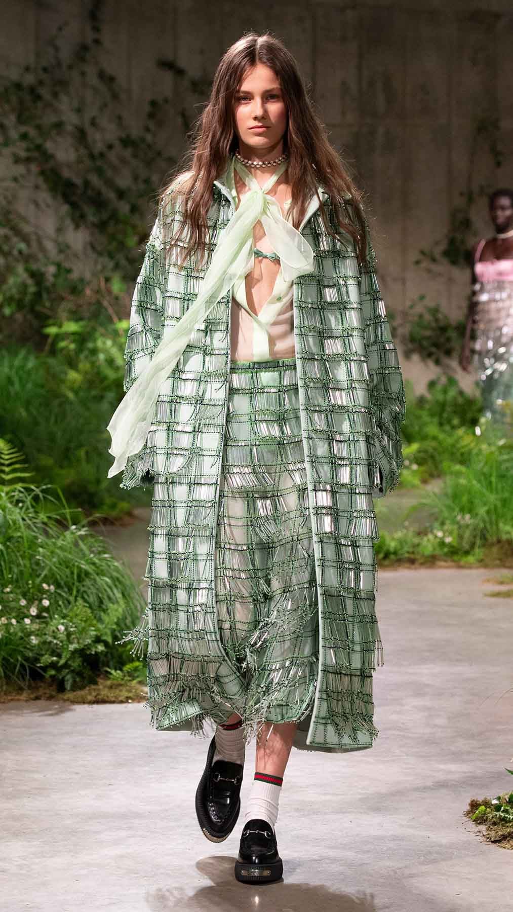 Στην Gucci Cruise 2025 συλλογή, δεν υπήρχαν πια οι ψηλές πλατφόρμες της περασμένης σεζόν. Αντικαταστάθηκαν από παπούτσια υβρίδια, κάτι ανάμεσα σε μοκασίνια και μπαλαρίνες.