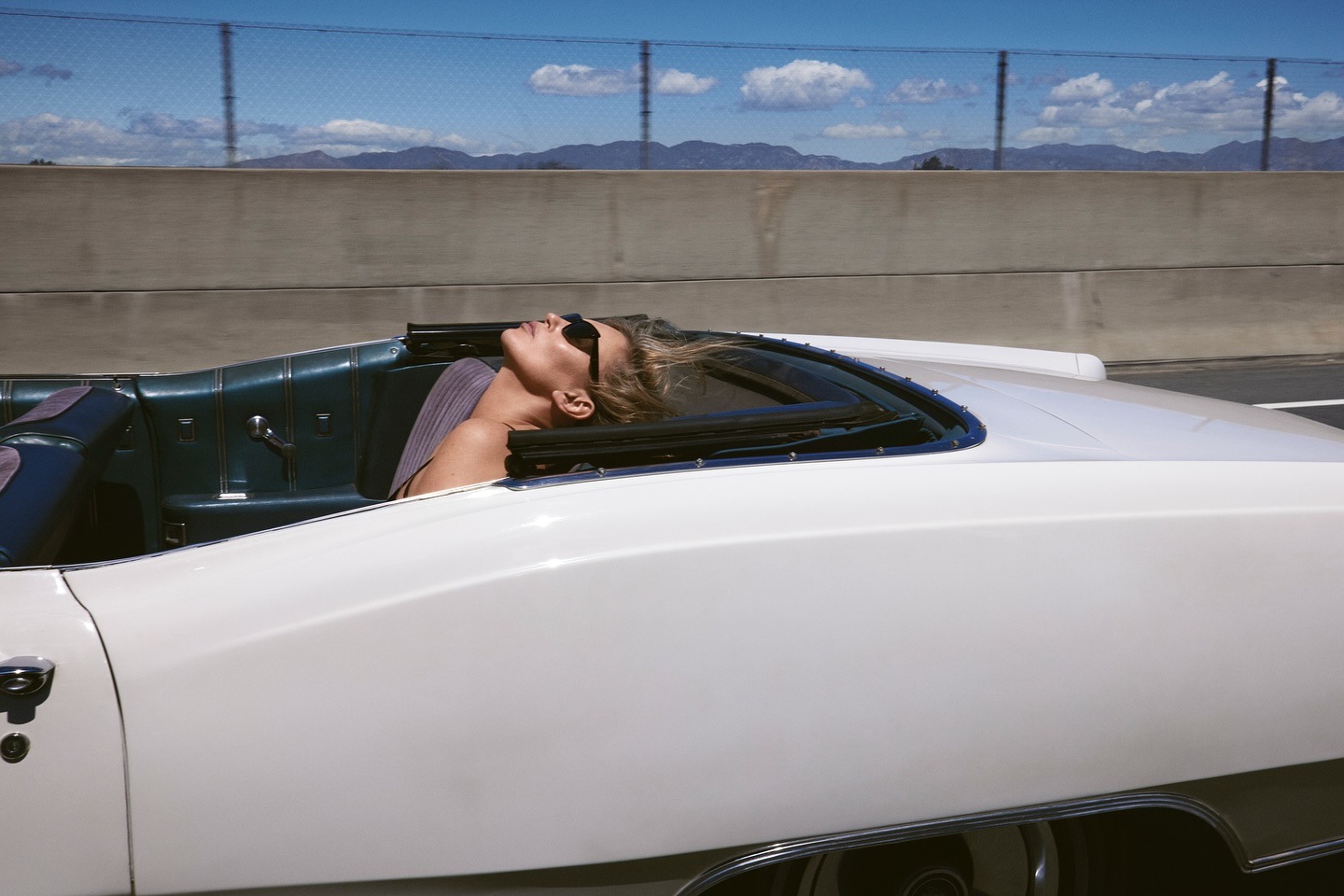 Ο φακός του Mert Alas απαθανατίζει τις δύο μούσες σε σκηνές χωρίς σκηνοθεσία ή σενάριο, δημιουργώντας την αίσθηση ενός καλοκαιρινού road movie στο Λος Άντζελες. Η Moss οδηγεί ένα ρετρό κάμπριο φορώντας ένα shearling παλτό σε γήινες αποχρώσεις, πάνω από ένα μικρό μαύρο φόρεμα, εκπέμποντας άνεση και διαχρονική κομψότητα.
