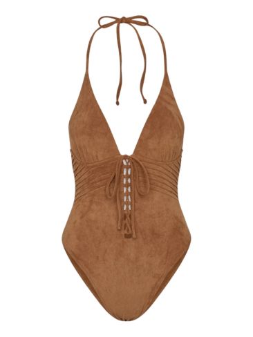 Η υφή του σουέντ κάνει δυναμικό comeback – αλλά αυτή τη φορά στην παραλία. Τα ολόσωμα μαγιό με suede υφές προσφέρουν μια boho, πολυτελή αίσθηση που ξεχωρίζει. Ενδείκνυνται για τις πιο fashionable εμφανίσεις κάτω από τον ήλιο και δίνουν έναν απρόσμενο χαρακτήρα σε ένα κατά τα άλλα "κλασικό" item.