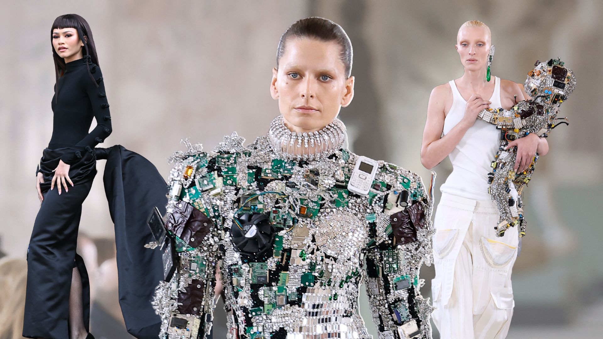 Από τα looks που ξεχώρισαν ήταν ένα μίνι φόρεμα, στολισμένο με αντικείμενα -κομμάτια παλιάς τεχνολογίας- όπως καλώδια, δισκέτες, κομπιουτεράκια, τσιπάκια ακόμα και κινητά τηλέφωνα, όλα αυτά ανακατεμένα με κρύσταλλα. Στο ίδιο mood ακολουθούσε το μοντέλο Maggie Maurer με σύνολο από παντελόνι με τσέπες και λευκό tank top, κρατώντας στην αγκαλιά της ένα μωρό-ρομπότ, επίσης καλυμμένο με tech pieces.