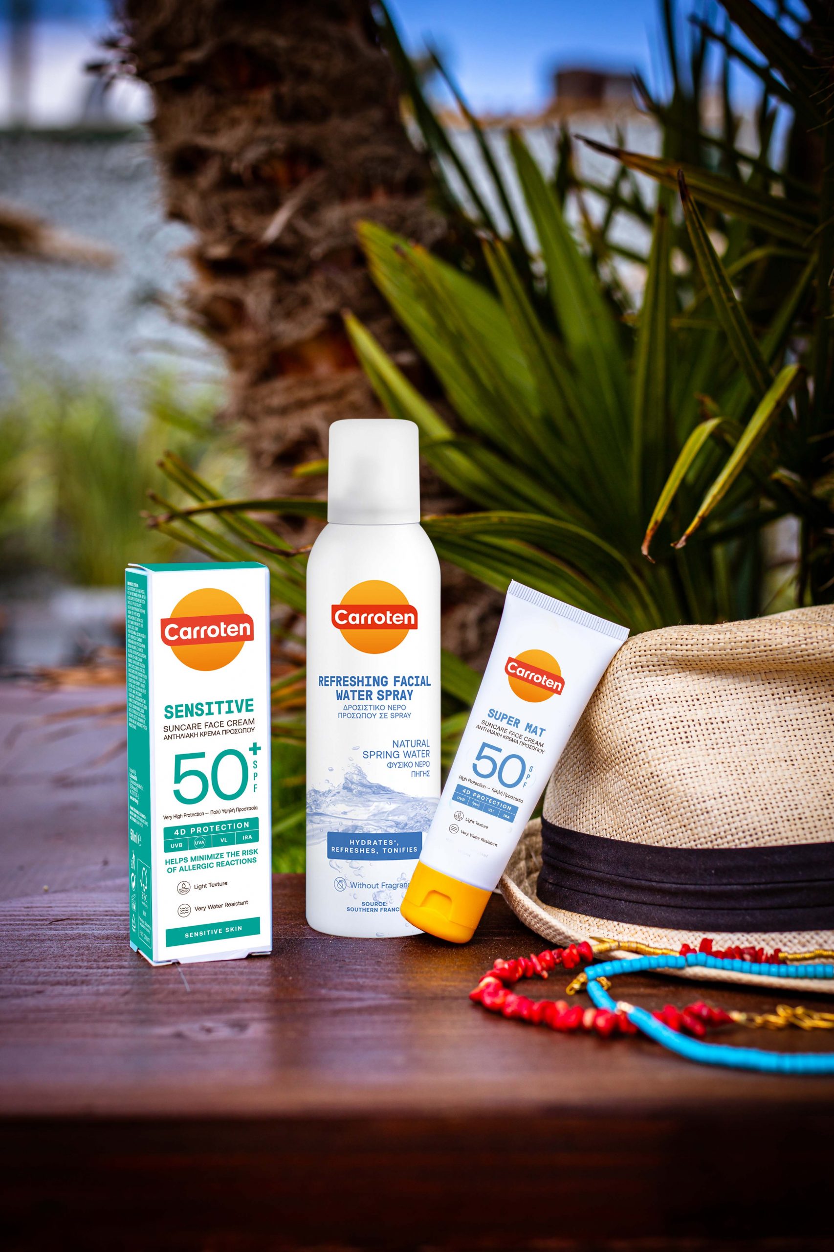 Για την εξειδικευμένη αντηλιακή προστασία προσώπου, το Carroten παρουσιάζει μια ολοκληρωμένη σειρά προϊόντων -δερματολογικά & οφθαλμολογικά ελεγμένα- με υψηλής ποιότητας συστατικά, προηγμένη τεχνολογία, ανάλαφρη σύνθεση και άμεση απορρόφηση για λαμπερή και υγιή επιδερμίδα. Τα αντηλιακά προσώπου Carroten, εκτός της μέγιστης 4D προστασίας από την επιβλαβή και υπέρυθρη ακτινοβολία, εμπεριέχουν υαλουρονικό οξύ, το οποίο προσφέρει βαθιά ενυδάτωση και βιταμίνη Ε που συμβάλλει στην πρόληψη της γήρανσης της επιδερμίδας, χάρη στην αντιοξειδωτική της δράση. Ανάλογα με τις ανάγκες της επιδερμίδας, μπορεί κανείς να επιλέξει την αντηλιακή κρέμα προσώπου Super Mat, κατάλληλη για κανονικές/ λιπαρές επιδερμίδες για όψη χωρίς γυαλάδα ή την CC για όλους τους τύπους επιδερμίδας, για έναν ομοιόμορφο χρωματικό τόνο. Για ευαίσθητες επιδερμίδες, το Carroten παρουσιάζει την αντηλιακή κρέμα Sensitive, η οποία μειώνει τον κίνδυνο των αλλεργικών αντιδράσεων ενώ για τις ώριμες επιδερμίδες την Anti Age-Anti Spot, με προηγμένη τεχνολογία Age Block που προλαμβάνει και μειώνει την εμφάνιση των λεπτών γραμμών, των ρυτίδων και των πανάδων που προκαλούνται από την έκθεση στον ήλιο.