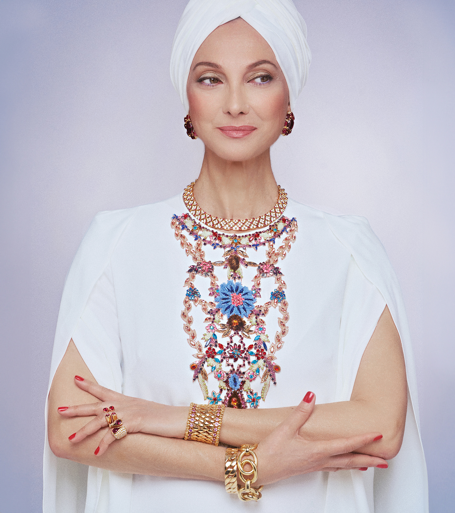 Φόρεμα VASSILIS ZOULIAS. Καρφίτσα-λουλούδι με μοβ-ροζ ζαφείρια, μπριγιάν και στο κέντρο μαρκίζα rock crystal, (δεξιό χέρι) βραχιόλι από λευκόχρυσο με ροζ οπαλίνα, ροζ δαχτυλίδι με μοβ allunite και φίδι με ροζ ζαφείρια και αμέθυστους, (αριστερό χέρι) βραχιόλι από ροζ χρυσό με χρυσές μπίλιες, βραχιόλι με λευκούς αχάτες και μπριγιάν και δαχτυλίδι από ροζ χρυσό με ασημένιο ματ μοτίβο, μπριγιάν και ροζ quartz SERKOS.