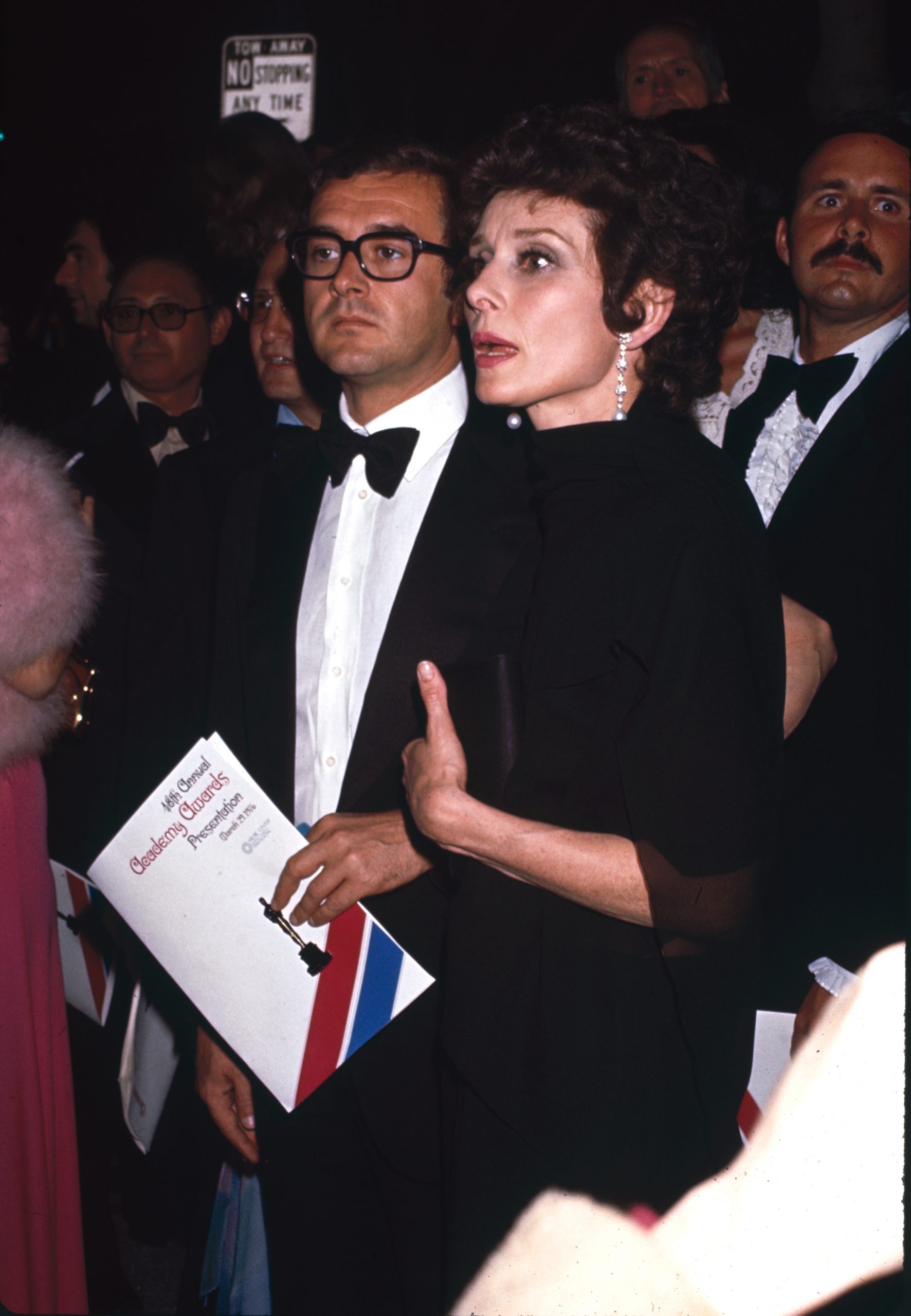 Η Audrey Hepburn με τον δεύτερο σύζυγό της Ιταλό ψυχίατρο Andrea Dotti στην 48η απονομή των βραβείων τον Μάρτιο του 1976. Και ο δεύτερο γάμος της ηθοποιού θα κατέληγε σε διαζύγιο έξι χρόνια αργότερα, παρότι εκείνη είχε αφήσει την καριέρα της για να αφοσιωθεί στην οικογένεια της. (Getty Images/Ideal Image)