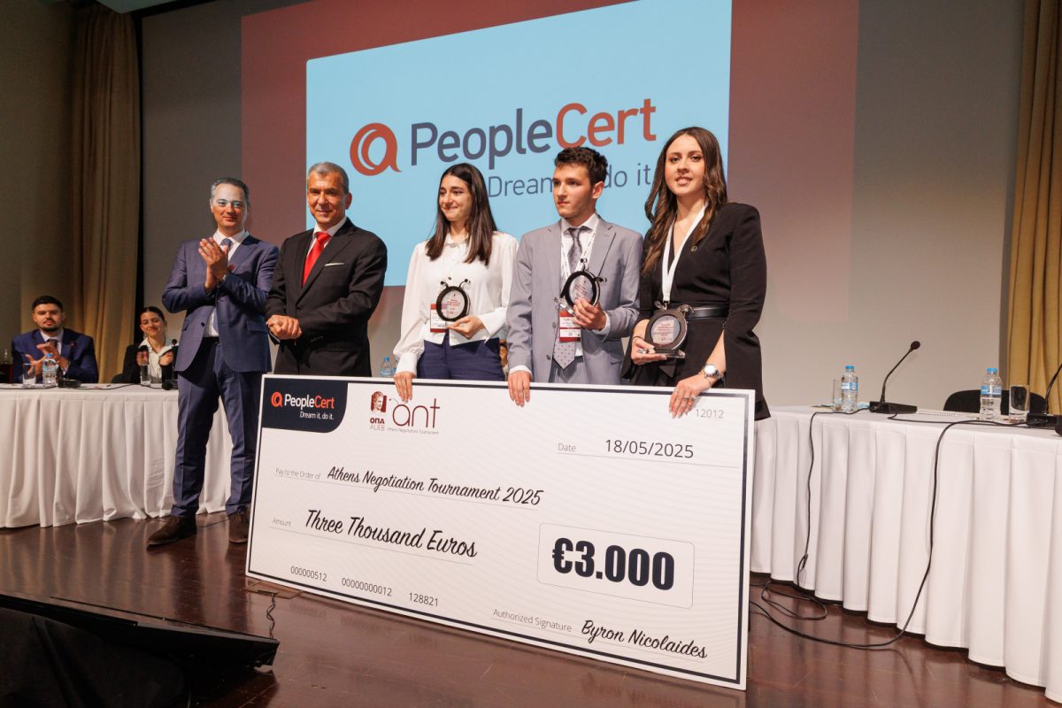 Στο πλαίσιο της τελετής του Τελικού, ο Πρύτανης του Οικονομικού Πανεπιστημίου Αθηνών, Καθηγητής Βασίλης Βασδέκης, βράβευσε την περσινή νικήτρια ομάδα του ΑΝΤ 2024, η οποία εκπαιδεύτηκε από την επιστημονική ομάδα του ΑΝΤ και εκπροσώπησε το ΟΠΑ με την οικονομική υποστήριξη της EY Greece στον διεθνή διαγωνισμό διαπραγματεύσεων Warsaw Negotiation Round (WNR) κατακτώντας την 1η θέση!