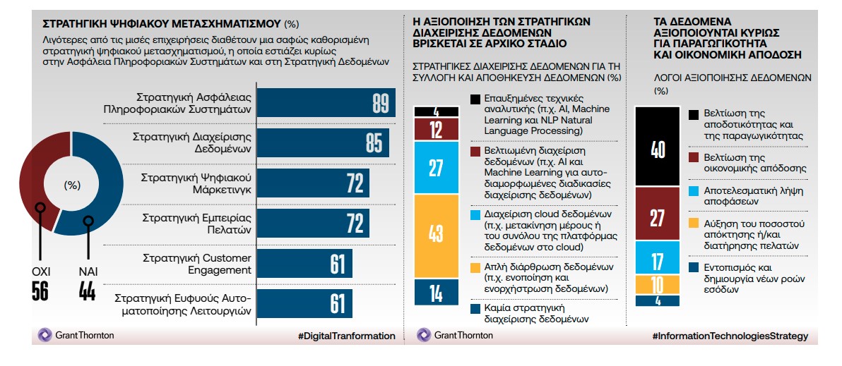 Μία ακόμα σημαντική παράμετρος που μελετήθηκε στην έρευνα ήταν το ποσοστό των επιχειρήσεων που αξιοποιούν τεχνολογίες ανάλυσης δεδομένων. Συγκεκριμένα, τα ευρήματα της έρευνας έδειξαν ότι πάνω από 7 στις 10 επιχειρήσεις χρησιμοποιούν τεχνολογίες ανάλυσης δεδομένων, με τη χρήση τους να προορίζεται κυρίως για τη βελτίωση της αποδοτικότητας και της παραγωγικότητας μιας επιχείρησης, καθώς και για την ενίσχυση των οικονομικών τους αποτελεσμάτων.