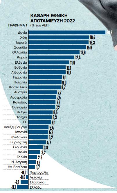 Η αποταμίευση για κάθε τομέα ισούται με τη διαφορά μεταξύ διαθέσιμου εισοδήματος και κατανάλωσης. Μάλιστα αποταμιεύουμε λιγότερο όχι μόνο σε σύγκριση με πλουσιότερες, αλλά και με πολύ φτωχότερες χώρες. Το ποσοστό εθνικής αποταμίευσης είναι χαμηλότερο όχι μόνο από τη Γαλλία, τη Γερμανία και τον Καναδά, αλλά και από χώρες όπως η Βραζιλία, η Νότια Αφρική και το Μεξικό – το Γράφημα 1 αποτυπώνει την κατάσταση για το 2022.