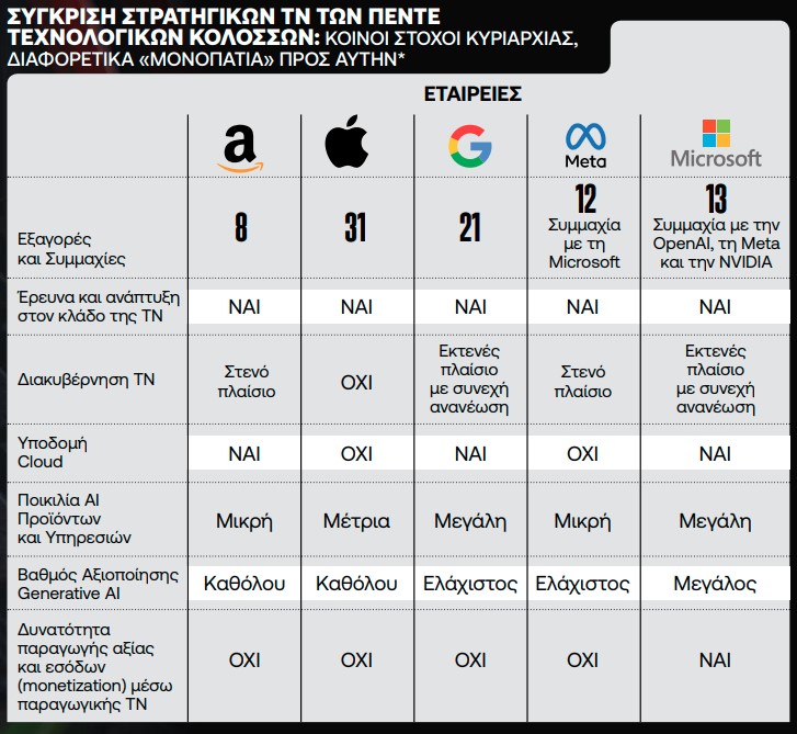 Οι τεχνολογικοί κολοσσοί Amazon, Apple, Google, Meta και Microsoft ανήκουν στις πολυτιμότερες εταιρείες του κόσμου σε χρηματιστηριακή αξία, έχουν έσοδα που αγγίζουν εκατοντάδες δισεκατομμύρια δολάρια ετησίως και χρησιμοποιούν τεχνολογίες ΤΝ και μηχανικής μάθησης προκειμένου να επικρατήσουν στον κλάδο της τεχνολογίας, ακολουθώντας σε πολλές περιπτώσεις αρκετά διαφορετική στρατηγική η μία από την άλλη.