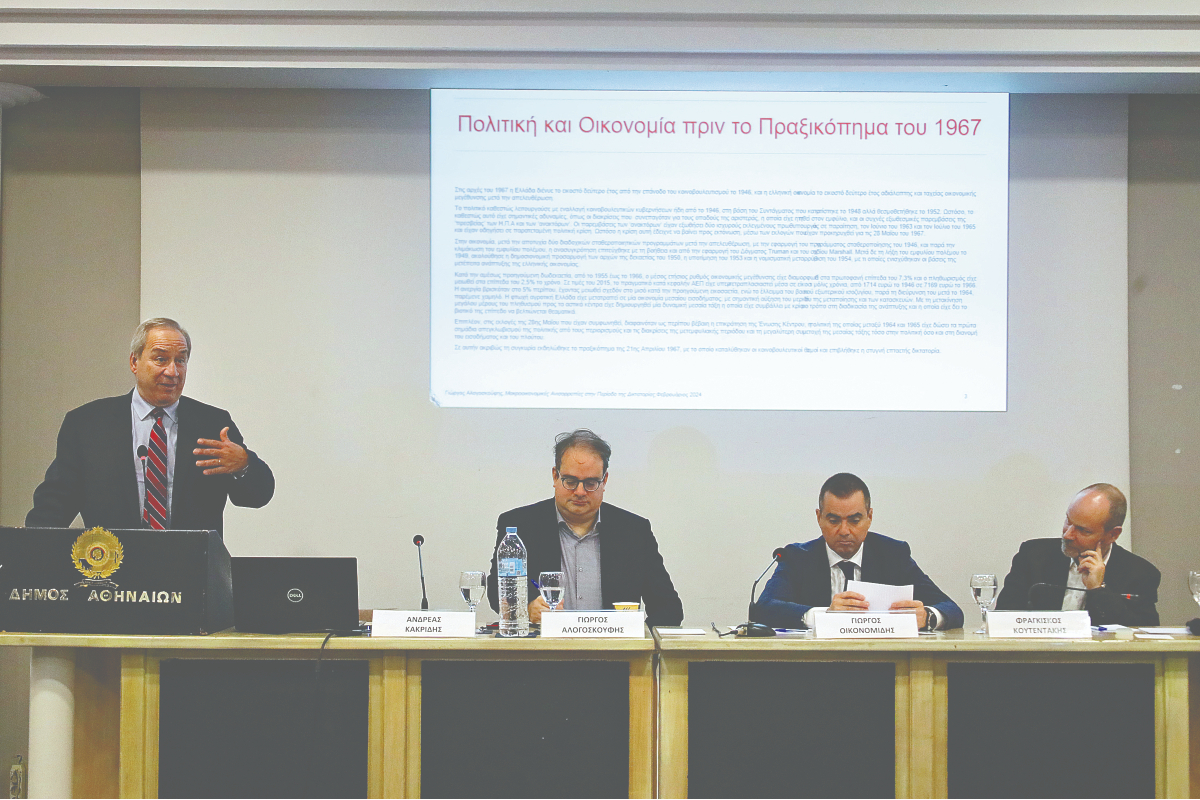 Σε αυτήν ακριβώς τη συγκυρία εκδηλώθηκε από τη χούντα των συνταγματαρχών το πραξικόπημα της 21ης Απριλίου 1967 και επιβλήθηκε μια στυγνή επταετής Δικτατορία. Οι κυβερνήσεις της Δικτατορίας δεν επιχείρησαν αρχικά να αλλάξουν τον χαρακτήρα της οικονομικής πολιτικής των προηγούμενων δεκαετιών. Άλλωστε δεν ήταν σε θέση να σχεδιάσουν οι ίδιοι μια εναλλακτική οικονομική πολιτική. Ωστόσο, στην πορεία οδηγήθηκαν σε υπερβολές, ακρότητες και λάθος επιλογές, οι οποίες, σε συνδυασμό με διεθνείς διαταραχές όπως η κατάρρευση του συστήματος του Bretton Woods και η πρώτη πετρελαϊκή κρίση, οδήγησαν στον στασιμοπληθωρισμό του 1974, ανέδειξαν τις αδυναμίες του μετεμφυλιακού υποδείγματος ανάπτυξης της ελληνικής οικονομίας και οδήγησαν στο τέλος του μετεμφυλιακού ελληνικού οικονομικού «θαύματος».