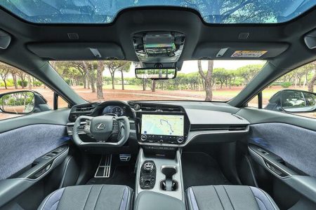 Την ίδια στιγμή οι επιλογές ισχύος είναι τρεις, με τη «βασική» έκδοση RZ 350e να αποδίδει 224 ίππους και 269 Nm ροπής που φτάνουν στους μπροστινούς τροχούς, την ενδιάμεση τετρακίνητη RZ 500e με τους 381 ίππους και τα 538 Nm ροπής να καταγράφει αυτονομία 500 χλμ. με μία επαναφόρτιση και την κορυφαία τετρακίνητη RZ 550e F-SPORT (των σχεδόν 450 χλμ. αυτονομίας) που κάνει ό,τι υποδηλώνει ο τίτλος της, καθώς οι 408 ίπποι της εξασφαλίζουν επιτάχυνση από στάση σε 4,4 δευτερόλεπτα (με ειδικές ρυθμίσεις στην ανάρτηση – MacPherson στον μπροστινό άξονα, διπλά ψαλίδια στον πίσω) και εμφανώς σπορ οδική συμπεριφορά, για την οποία θα μιλήσουμε σε επόμενο χρόνο. Αναβαθμισμένο εμφανίζεται και το ηλεκτρονικά ελεγχόμενο σύστημα τετρακίνησης DIRECT4 που με κριτήρια τη γωνία του τιμονιού, τον βαθμό πρόσφυσης των τροχών και την ταχύτητα του αυτοκινήτου προσφέρει πλέον μεγαλύτερο εύρος κατανομής της ροπής στον μπροστινό και τον πίσω άξονα (από 80:20 έως 0:100), πάντοτε σε συνδυασμό με τη χαρτογράφηση της μονάδας ελέγχου των δυναμικών χαρακτηριστικών του αυτοκινήτου (Vehicle Dynamics Integrated Management).