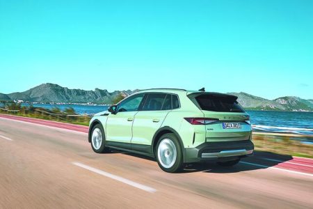 Πραγματικά σημαντικό ωστόσο είναι το προφίλ του Elroq, καθώς ο αεροδυναμικός συντελεστής Cd 0.26 δεν διαμορφώνει απλώς το σχήμα αλλά επηρεάζει και την αποδοτικότητα, αυξάνοντας μέσω της σχεδίασης την αυτονομία του με μία φόρτιση. Ανάλογα με την έκδοση αμαξώματος (και στην περίπτωση αυτού που εμείς οδηγήσαμε) τα μαύρα πρόσθετα πλαστικά στους θόλους των τροχών υπογραμμίζουν το SUV ύφος, ενώ το πίσω τμήμα αναδιατυπώνει στοιχεία που έχουμε συναντήσει σε μεγαλύτερα Skoda όπως, για παράδειγμα, το Superb Combi.