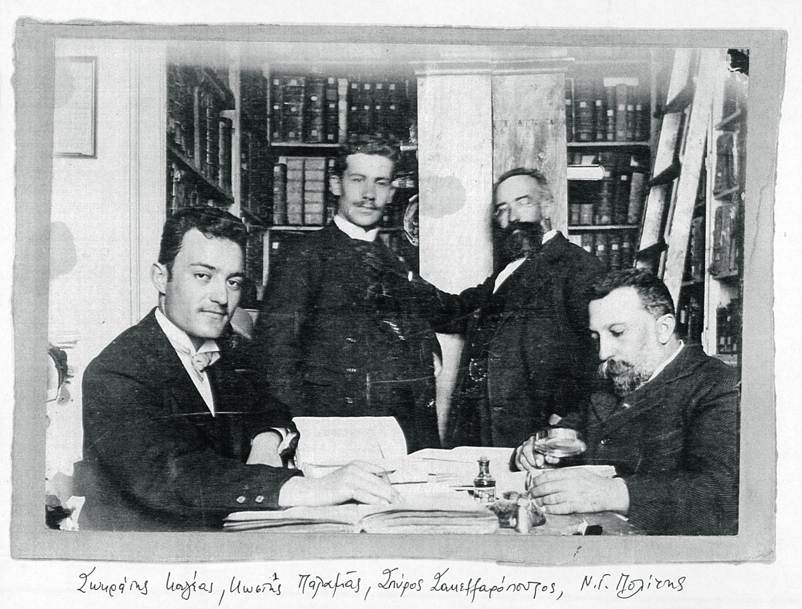 Από αριστερά: Ο καθηγητής Αρχαίας Ιστορίας Σωκράτης Κουγέας, ο (νεαρός) Κωστής Παλαμάς, ο καθηγητής Λατινικής Φιλολογίας Σπυρίδων Σακελλαρόπουλος και ο Νικόλαος Πολίτης με τον μεγεθυντικό φακό
