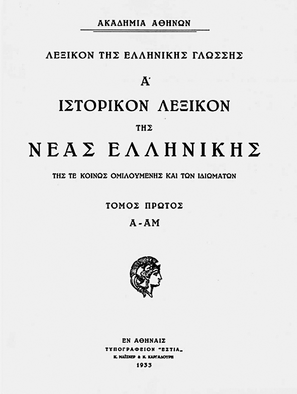 Ο πρώτος τόμος από το «Ιστορικόν Λεξικόν της Νέας Ελληνικής Γλώσσης της τε Κοινώς Ομιλουμένης και των Ιδιωμάτων»