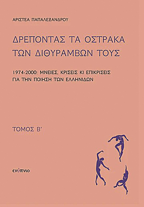 Στο βάθος ενός καφέ της Φωκίωνος Νέγρη στην Κυψέλη ενώ ένα ζωηρό πλήθος πηγαινοέρχεται έξω, συνομιλούμε με την ποιήτρια Αριστέα Παπαλεξάνδρου για την ποίηση όχι όπως τη ζει ως δημιουργός αλλά όπως την παρατηρεί ως ερευνήτρια φιλόλογος. Αφορμή η δίτομη μελέτη της Δρέποντας τα όστρακα των διθυράμβων τους (εκδ. Ενύπνιο), η έκδοση της διδακτορικής της διατριβής στην Ανώτατη Σχολή Καλών Τεχνών, με αντικείμενο τις μνείες, κρίσεις κι επικρίσεις για την ποίηση των Ελληνίδων στο διάστημα 1974-2000.