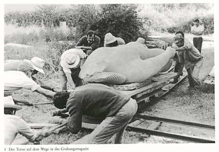 Οπως διαβάζουμε σε άλλη ιστορία του DAI Αθηνών από τον Γιαν-Μαρκ Χένκε, επιστρατεύθηκε ένα ειδικό βαγονέτο από το Βερολίνο, τοποθετήθηκαν πάνω στις ράγες τα στρώματα ύπνου των μελών της ανασκαφικής ομάδας και το εντυπωσιακό εύρημα ξάπλωσε πάνω τους για να μεταφερθεί με ασφάλεια στην αποθήκη της ανασκαφής.