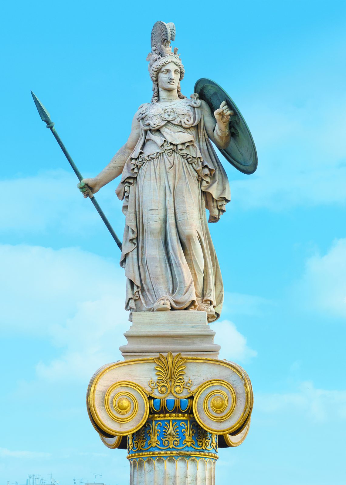 Το κολοσσικό μαρμάρινο άγαλμα της Αθηνάς (έργο του Λεωνίδα Δρόση), που μαζί με αυτό του Απόλλωνα κοσμούν εξωτερικά το κτίριο της Ακαδημίας. Φωτογραφία: Αρχείο Ακαδημίας Αθηνών/Κ. Ξενικάκης