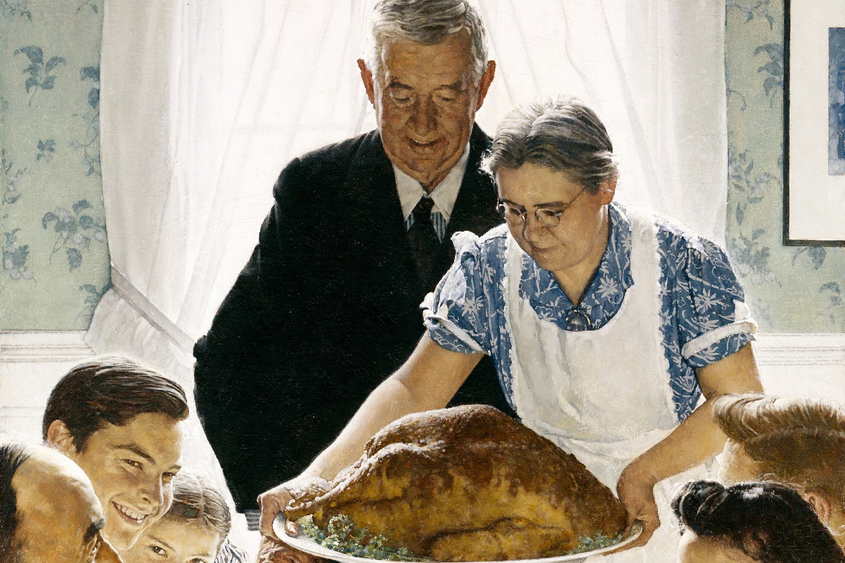 Αυτή η εξιδανικευμένη απεικόνιση της Ημέρας των Ευχαριστιών προβάλλει τις αμερικανικές οικογενειακές αξίες, υποδεικνύει όμως και την άρρηκτη διασύνδεση τροφής και κοινωνίας. Η χαρούμενη οικογένεια του 20ού αιώνα προφανώς δεν αντιμετωπίζει το φάσμα της πείνας, έχει κατακτήσει επομένως έναν βαθμό ελευθερίας άγνωστο στο προβιομηχανικό παρελθόν.