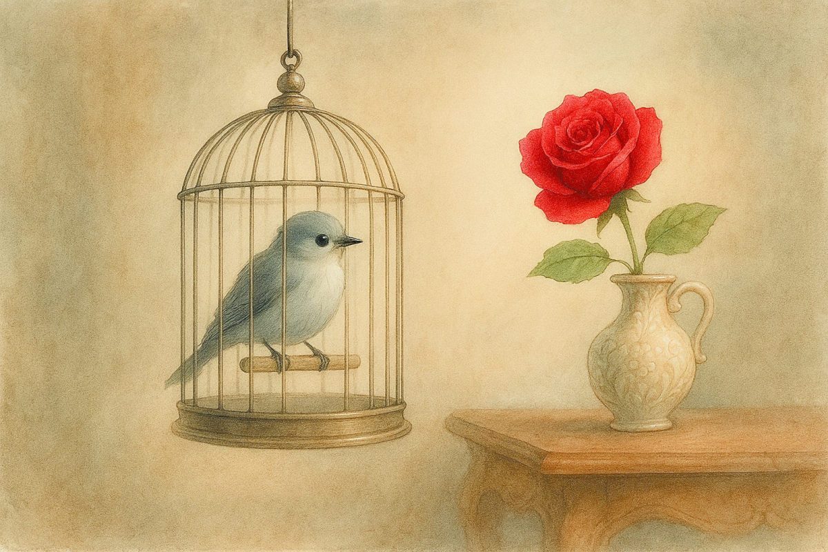 Το αιχμαλώτισαν και το κλείσαν σ’ ένα κλουβί, και – για καλή του τύχη – το κλουβί το κρέμασαν πλάι στην κονσόλα με το βαθυκόκκινο λουλούδι.