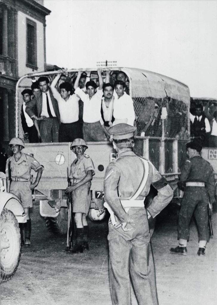 Αγωνιστές της ΕΟΚΑ μεταφέρονται σε φυλακές μετά τη σύλληψή τους από αγγλικά στρατεύματα. Φωτογραφία του 1957