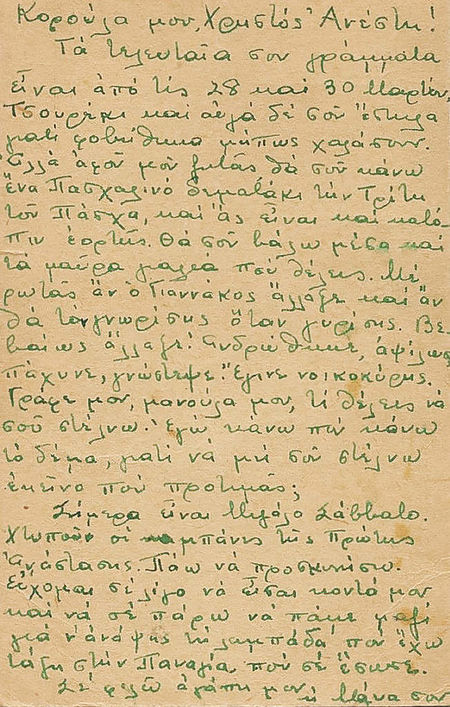 «Κορούλα μου, Χρηστός [sic] Ανέστη! Τα τελευταία σου γράμματα είναι από τις 28 και 30 Μαρτίου. Τσουρέκι και αυγά δε σου έστειλα γιατί φοβήθηκα μήπως χαλάσουν. Αλλά αφού μου ζητάς θα σου κάνω ένα Πασχαλινό δεματάκι την Τρίτη του Πάσχα, και ας είναι και κατόπιν εορτής. […] Σήμερα είναι Μεγάλο Σάββατο. Χτυπούν οι καμπάνες της πρώτης Ανάστασης. Πάω να προσκυνήσω. Εύχομαι σε λίγο να είσαι κοντά μου και να σε πάρω να πάμε μαζί για ν’ ανάψης τη λαμπάδα που έχω τάξη [sic] στην Παναγία, που σε έσωσε. Σε φιλώ αγάπη μου, η Μάνα σου».