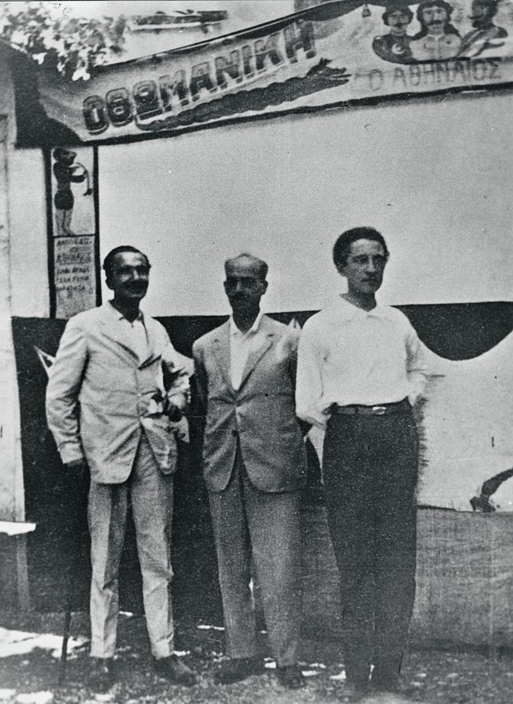 Ο Νίκος Καζαντζάκης με τον Παντελή Πρεβελάκη και τον εκδότη Κωνσταντίνο Ελευθερουδάκη στους Μύλους Πελοποννήσου (24 Ιουλίου 1927).
