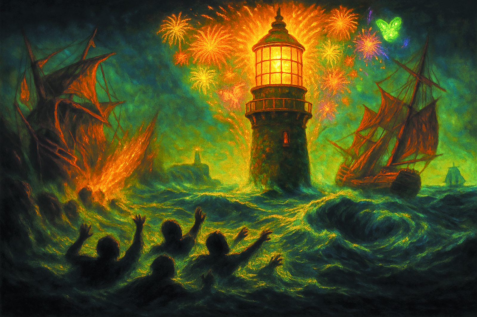 Ενα απόβραδο, φορτωμένο ομίχλη, που ανέβηκε να ελέγξει τα κάτοπτρα, παραξενεύτηκε: οι φωτεινές αναλαμπές έμοιαζαν αδύναμες, σαν να είχαν κουραστεί από την ίδια τη μονοτονία τους. Και τότε γεννήθηκε μέσα του μια παράτολμη ιδέα· με ποιο τρόπο να κάνει τον φάρο του μοναδικό. Τη ιδία νύχτα εκείνη, ένιωσε τον βοριά που λυσσομανούσε να τον ορμηνεύει: «Τόλμησέ το».
