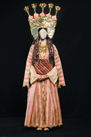 Ενδυμασία «Αθηναίας νύφης». Ο κεφαλόδεσμος αποτελεί κατασκευή βασισμένη στη λιθογραφία «Ελληνικός γάμος στην Αθήνα» του Louis Dupre